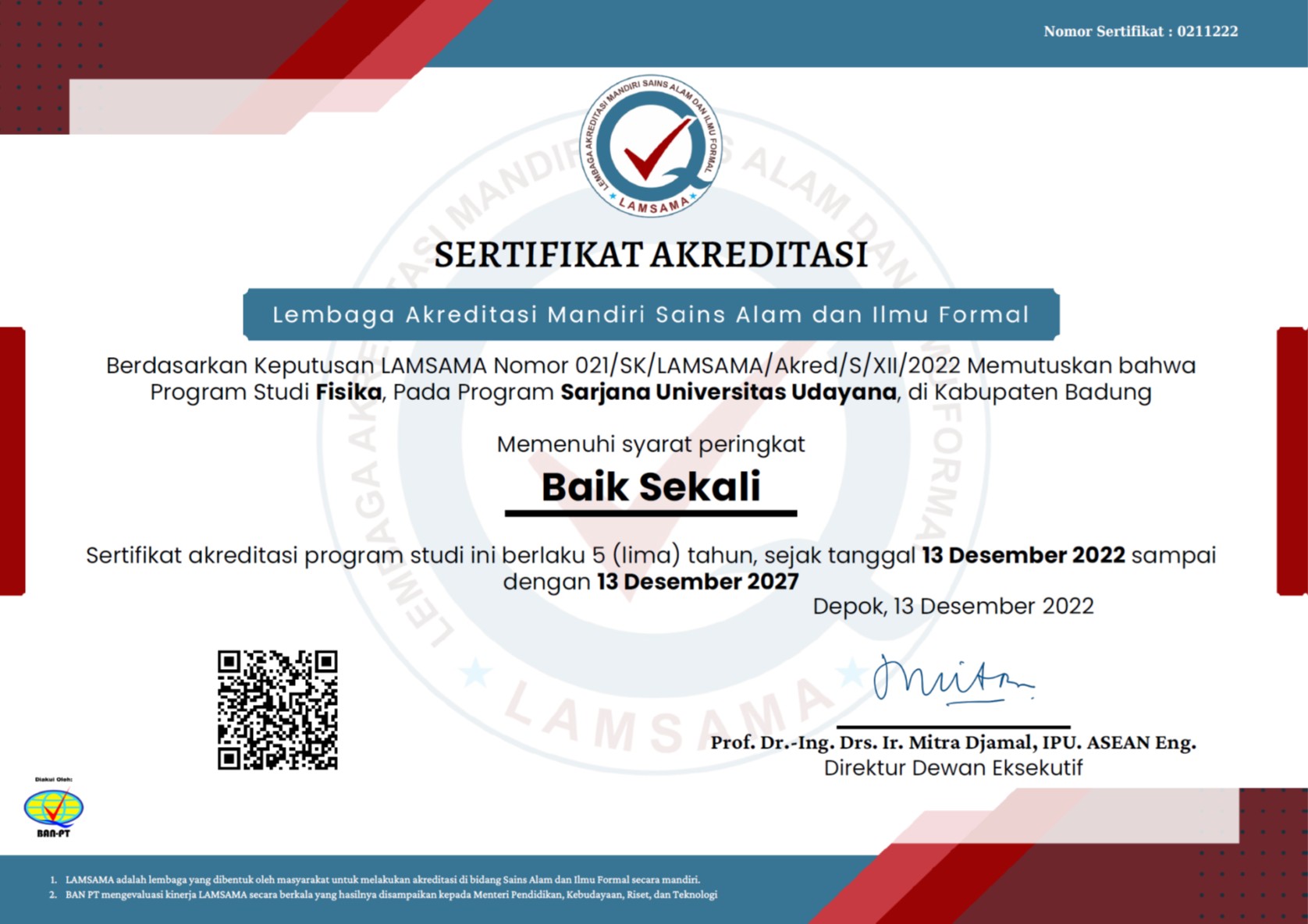 Physics study program of Universitas Udayana had accreditated by LAMSAMA. Let's download SERTIFIKAT and SK Akreditasi.