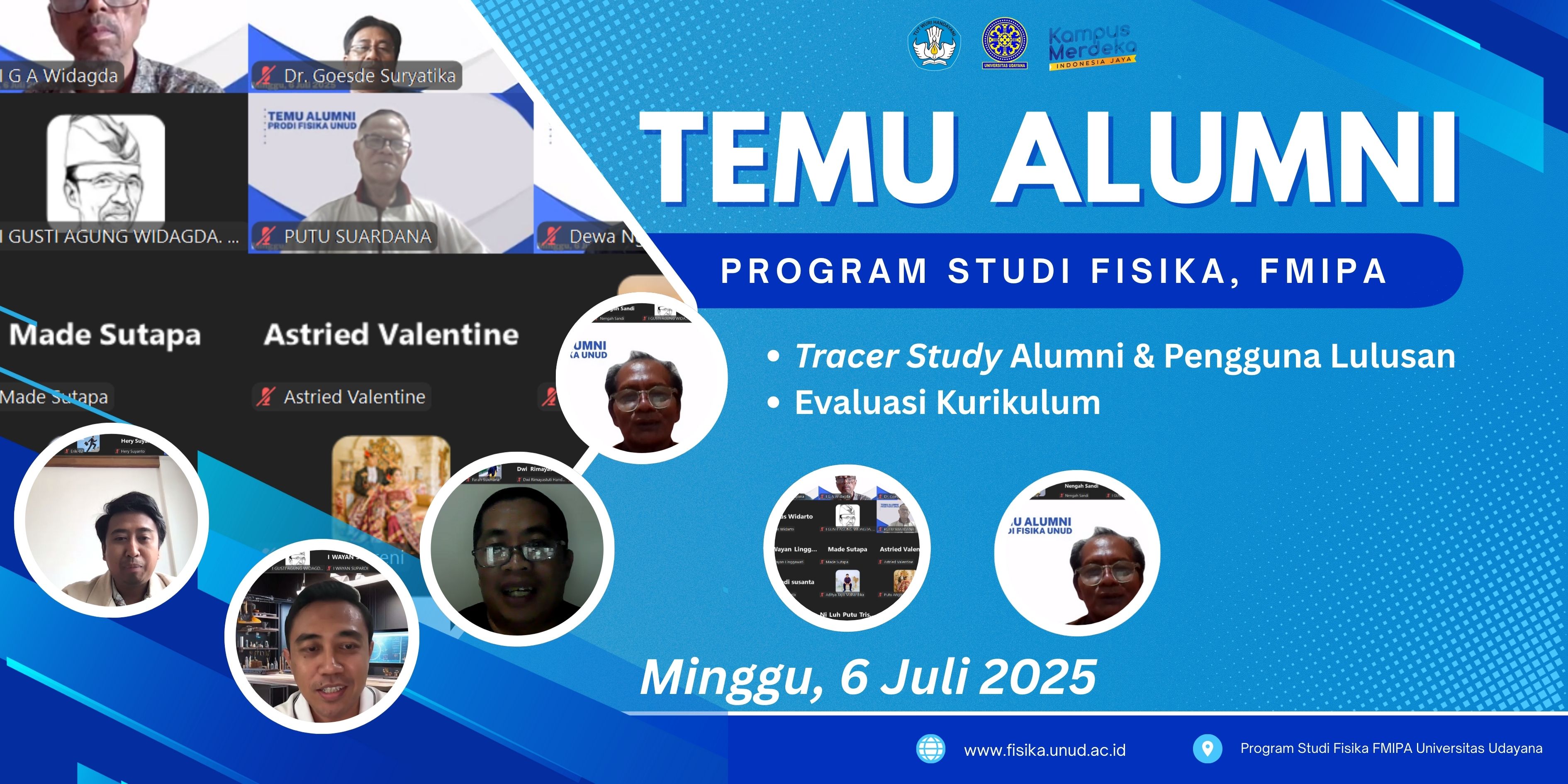 Sunday, July 6, 2025 online through the Zoom Meeting platform, the Physics Study Program, FMIPA, Universitas Udayana has successfully held an Alumni Gathering activity. At this event, 32 alumni of the Physics Study Program attended and provided constructive sharing and suggestions for improving the quality of the Physics Study Program in a sustainable manner in the future. This activity was also attended by the Chairperson of the Physics Alumni Association, namely Mr. Kicuk Bahariawan, S.Si. The main agenda discussed in this activity was: 1) Tracer Study of the Physics Study Program for alumni and graduate users; 2) Evaluation of the Study Program Curriculum that is More Adaptive to the world; 3) Opportunities for collaboration between the Physics Study Program and the agencies where alumni work. This activity was opened by the Coordinator of the Physics Study Program, Dr. Drs. Wayan Gede Suharta, M.Si. In his opening remarks, the Physics Study Program Coordinator hoped that this activity would be an initiative to foster friendship between alumni of the Physics Study Program and the alma mater so that in the future this friendship would be even closer. Meanwhile, no less importantly, the head of the Physics Study Program Tracer Study Team, I Gusti Agung Widagda, M.Si also emphasized the importance of alumni tracer studies in addition to being a barometer of the success of the Physics Study Program, also as a forum for conducting continuous evaluation of the implementation of education, so that in the future it can produce graduates who are adaptive and needed by the world of work.