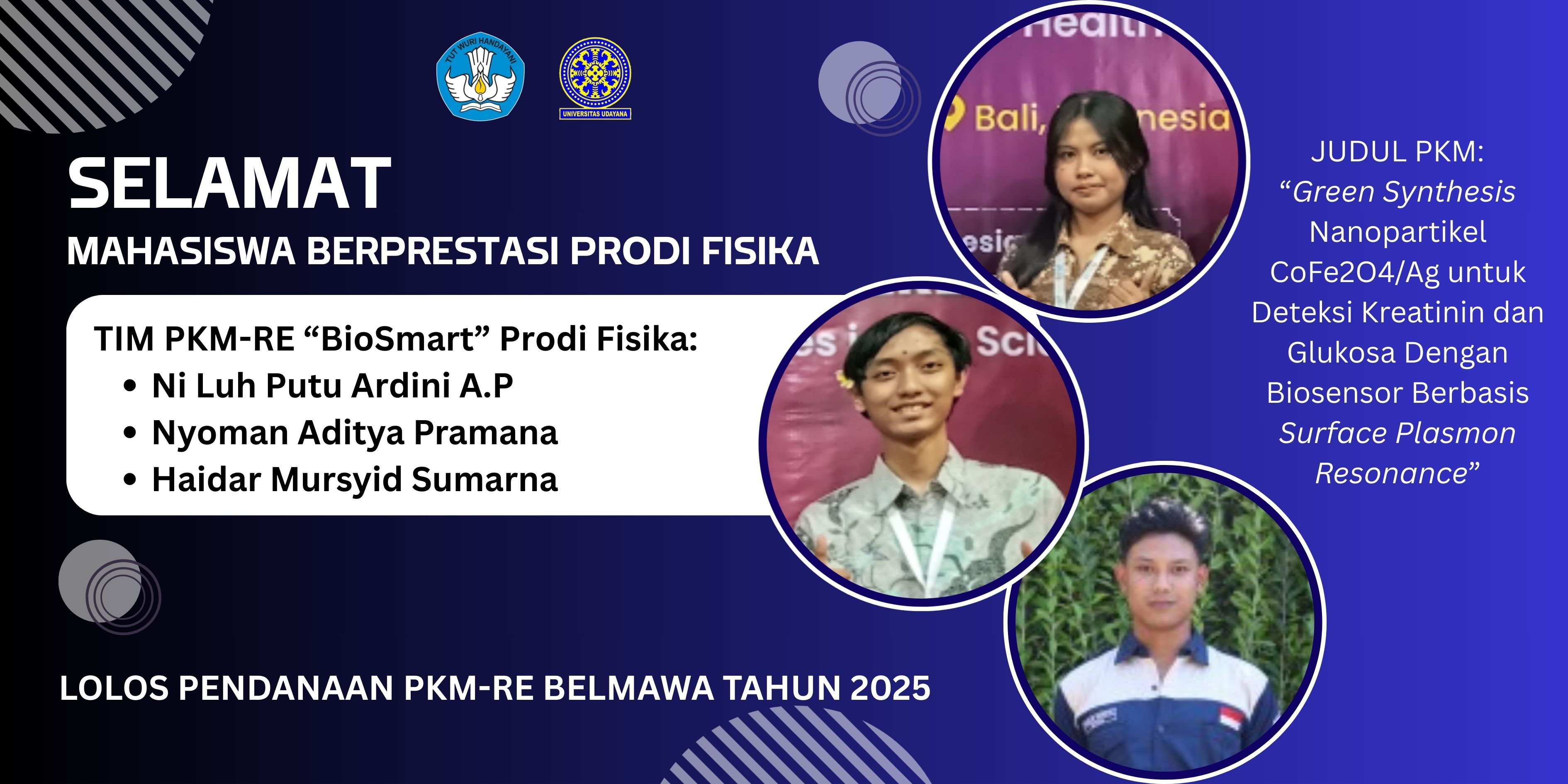Based on the 2025 PKM Funding Announcement Letter Number: 1995/B2/DT.01.00/2025, 1 PKM-RE team from the Physics Study Program, namely BioSmart, was declared successful in winning PKM-Exact Research funding entitled "Green Synthesis of CoFe2O4/Ag Nanoparticles for Detecting Creatinine and Glucose with Surface Plasmon Resonance-Based Biosensors". This team is chaired by Ni Luh Putu Ardini A.P, and consists of I Nyoman Aditya Pramana and Haidar Mursyid Sumarna. They are Physics Study Program students from the 2023, 2024, and 2022 intakes. This is a form of extraordinary achievement because from the Physics Study Program, this team is the only one to receive PKM funding from Belmawa-Kemendikti-Saintek since 2022. Hopefully, this PKM-RE can be implemented optimally so that it meets the target of qualifying for PIMNAS and even winning a medal in 2025. The more complete announcement for the PKM 2025 can be obtained through link (Click here).
